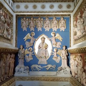 The Synagogue of Pécs was consecrated in 1869 by the Jewish Neolog community, whose principles are of a more reformed Judaism. Designed by architects Frigyes Feszl, Károly Gerster, and Lipót Kauser, the synagogue’s face is embellished with a clock and a Hebrew inscription that reads, „For my house, be called to the house of prayer for all peoples.” The building also boasts onion domes and other ornate exterior finishes; its seating is of the same dark slavonian oak as was used when it was built. Decorative detailing includes brilliantly colored ceilings displaying intricate stencil work, cast and wrought-iron columns with gilded capitals, and stylized architectural features. The synagogue still contains its original Angster organ.